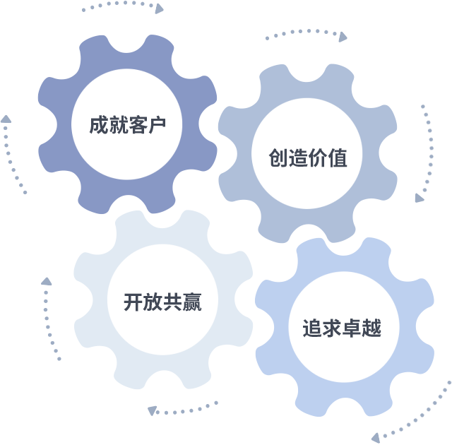 成就客户是一切决策的出发点,,,,创造价值是衡量所有工作的标准,,,追求卓越是我们做事做人的态度,,开放共赢是我们的格局也是最终的结果。。价值观的齿轮环环相扣,,推动着组织里的每个人不断向前。。。