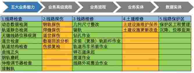在轨道运维业务中,,,,,,,,,,我们形成了完整的从业务能力(业务域)-业务流程-业务实体-数据模型的分析梳理过程。。。。。。。。。。轨道运维业务能力如下图所示::::::