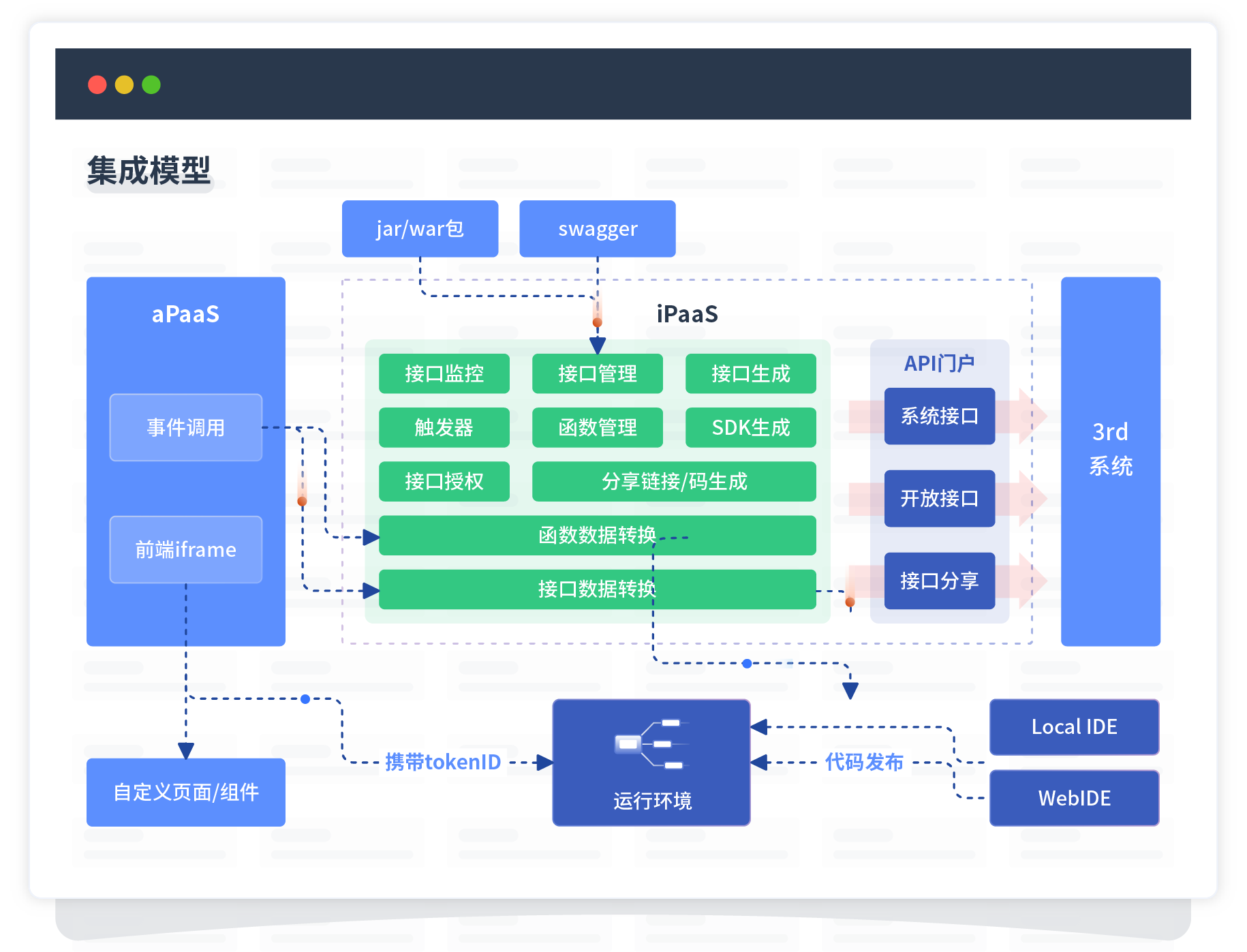 集成模型包括平台本身前、、、、后端能力的扩展,,,,,,,,,,,也支持通过API门户和第三方系统进行交互。。。。。。