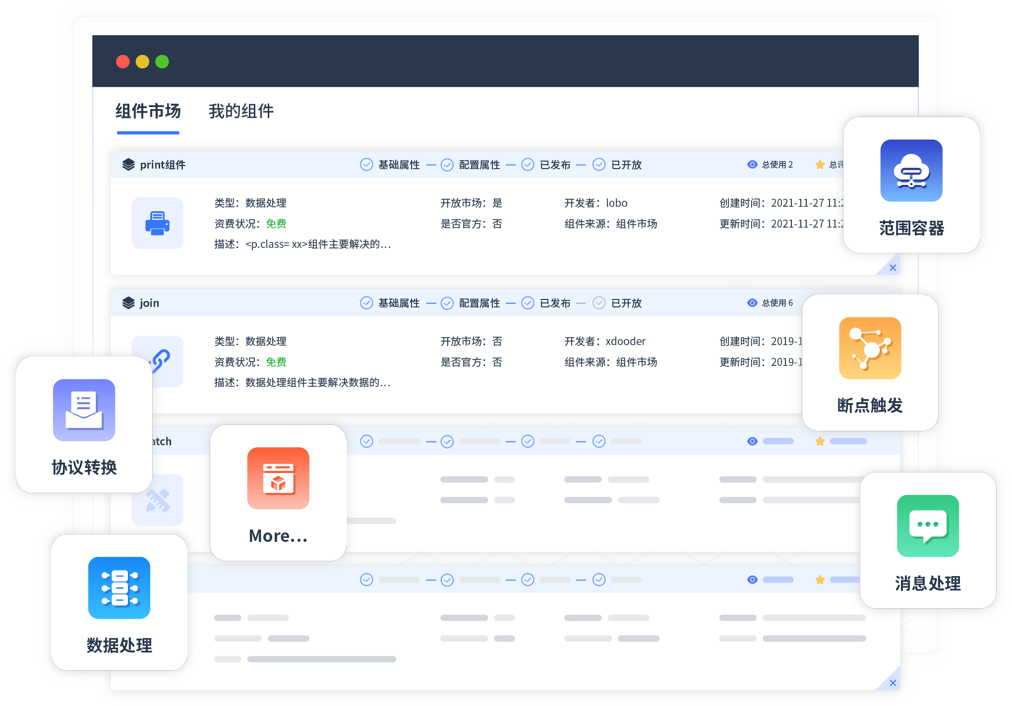 针对集成场景,,,,,,,,,VIVO钱包提供组件市场,,,,,,,,,,,例如协议转换、、、、、、消息处理、、、、、、、、、、、文件操作等。。。。。。。。。。。除平台提供的组件外,,,,,,,,,,,客户可以自定义所需组件。。。。。。。。。。。。
