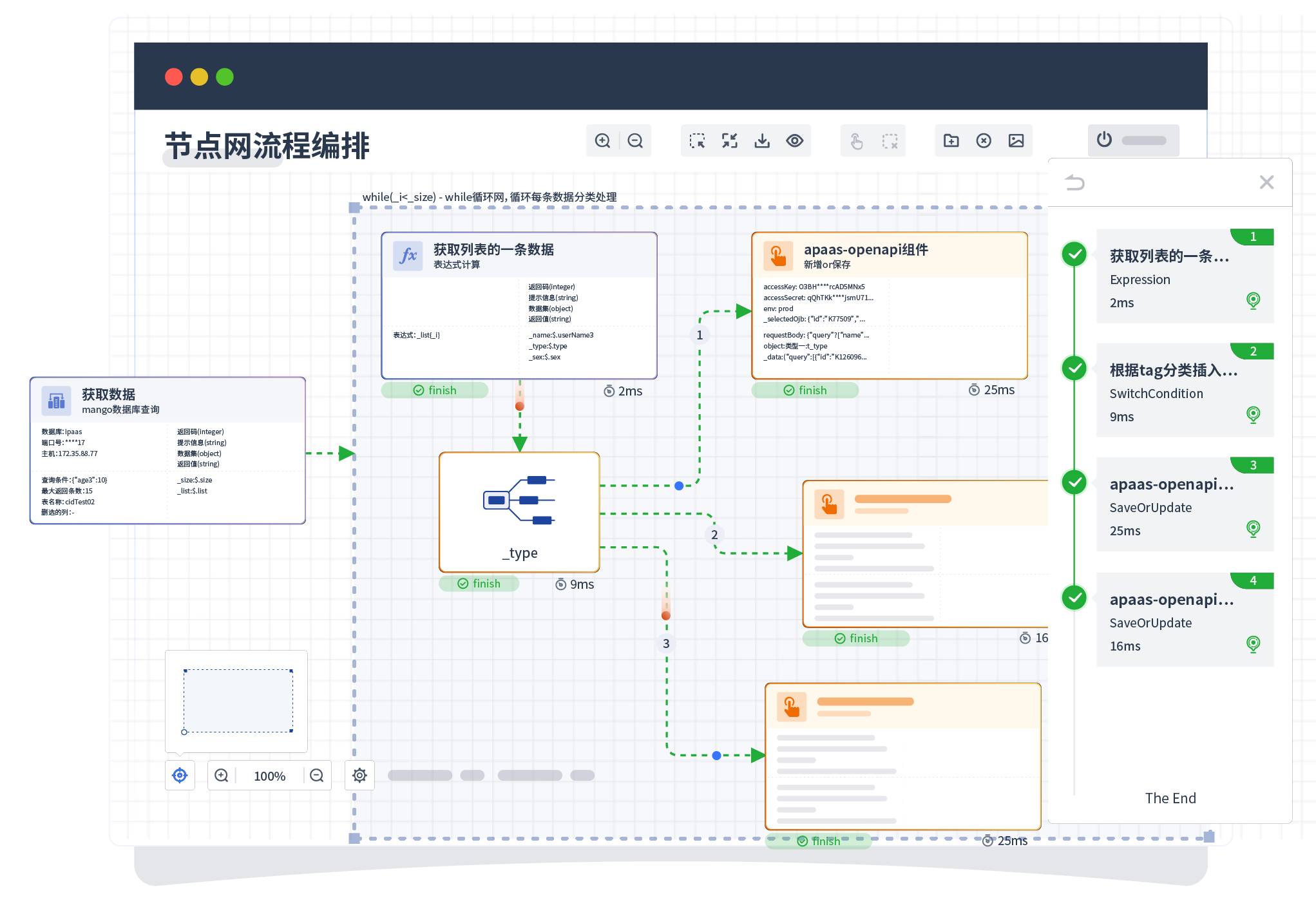 针对集成场景,,,,,,,,,,,组件定义后支持进行流程编制,,,,,,,,,,,不同于传统代码方式,,,,,,,,,,通过图形化展示,,,,,,,,支持在线调试、、、、、、、、、日志查看和运行回放。。。。。。。。。。。